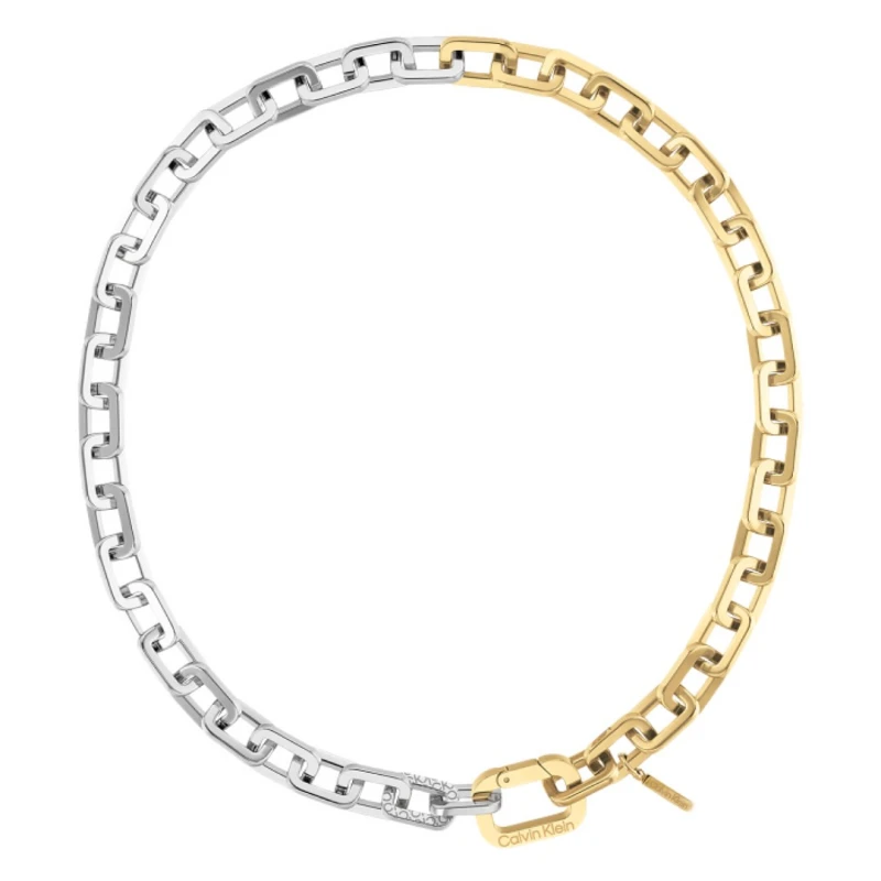Colorido colar para mulher da Calvin Klein Bold Metals em aço com uma coloração bicolorida em prateado e dourado. A sua composição de elos onde zircónias se encontram cravadas perto do fecho, evocam um brilho discreto num design minimalista vívido, destacando o look de uma mulher de forma sofisticada.