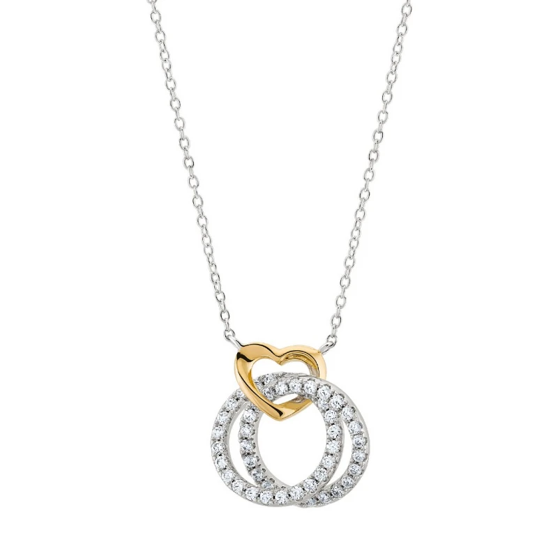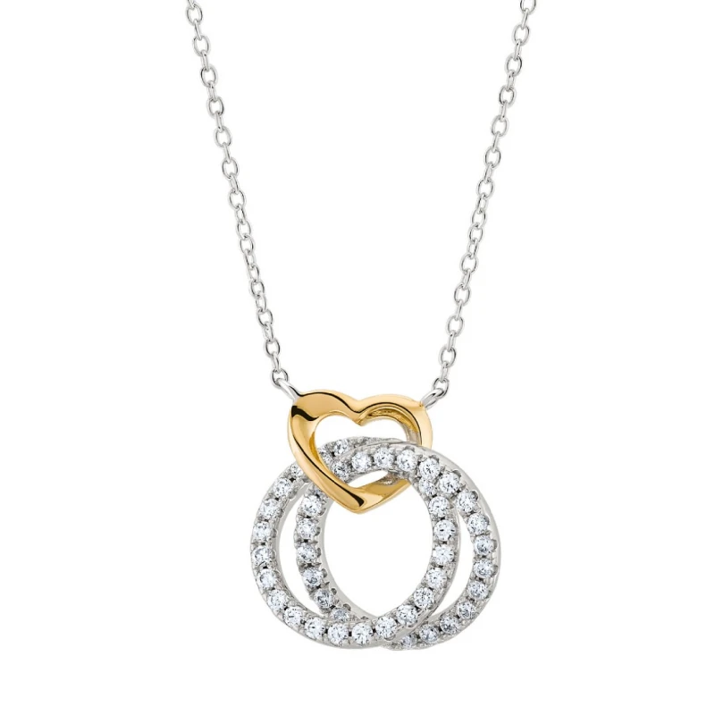 Sinta a magia do natal evolver-se sobre o look feminino com este deslumbrante colar Unike da Christmas Edition Double Circle. Elaborada em prata de lei 925, a malha fina prateada sustenta a expressão do amor sob o molde de um coração banhado em ouro dourado, que por si expõe uma conexão infinita com as duas formas circulares interligadas, cravadas de zircónias para um efeito de brilho constante e delicado. De modo a celebrar o amor, a composição de elementos expõe um contraste de cores e brilho vibrantes tornando-se um acessório ideal para uma mulher especial, criando uma estética deslumbrante com um toque visual encantador.