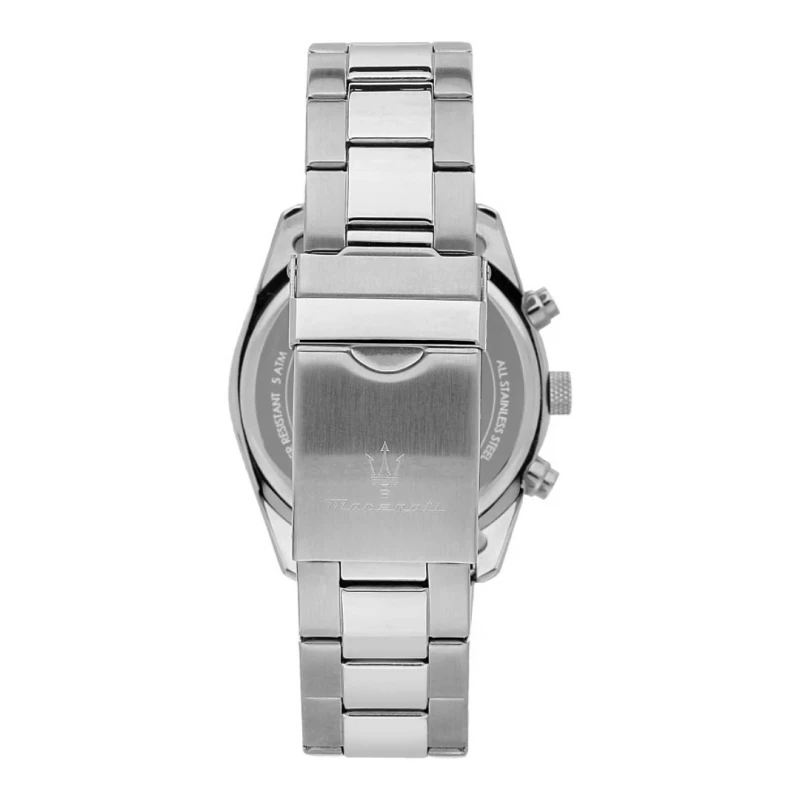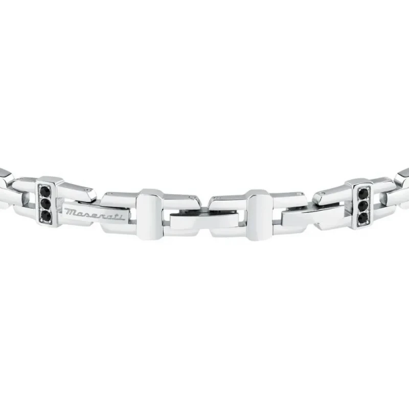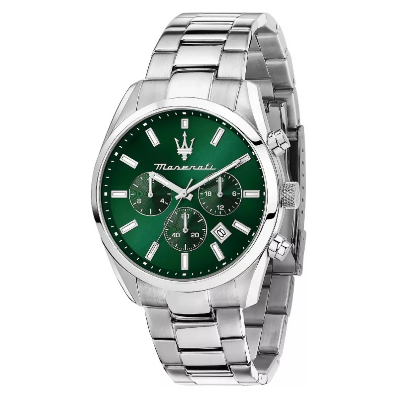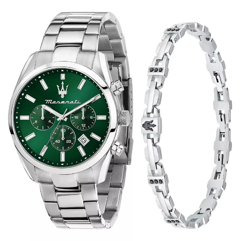 Combine elegância refinada a funcionalidade com este conjunto de um relógio e pulseira masculina da linha Attrazione da Maserati. Elaborados em aço inoxidável, de coloração prateada, a pulseira apresenta pequenos detalhes de pedras negras cravadas, criando um destaque harmonioso com o relógio analógico de mostrador verde, complementado de um cronógrafo protegido por vidro safira. Para um uso versátil, cada acessório adapta ao look um toque excêntrico e atento em providenciar um visual estético cheio de classe.