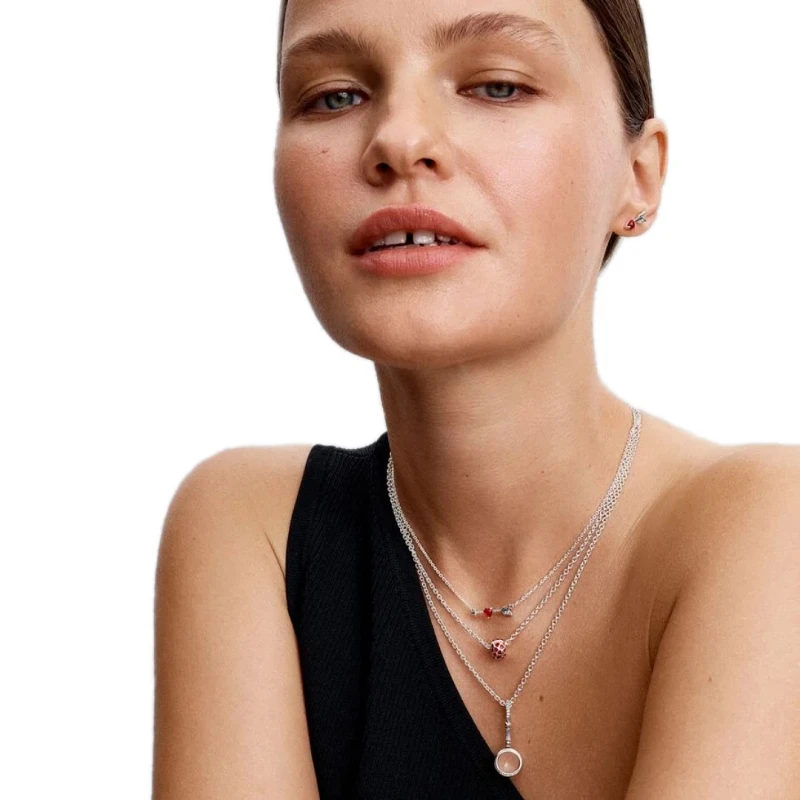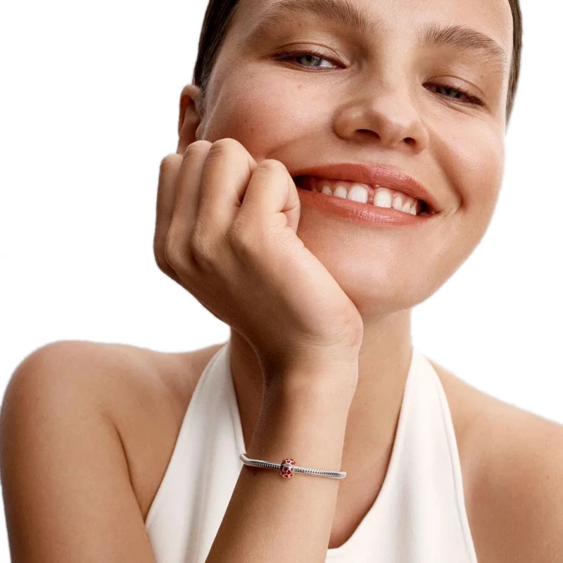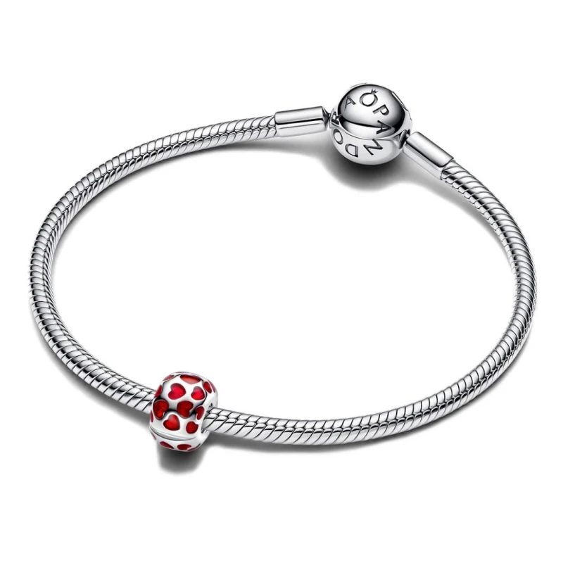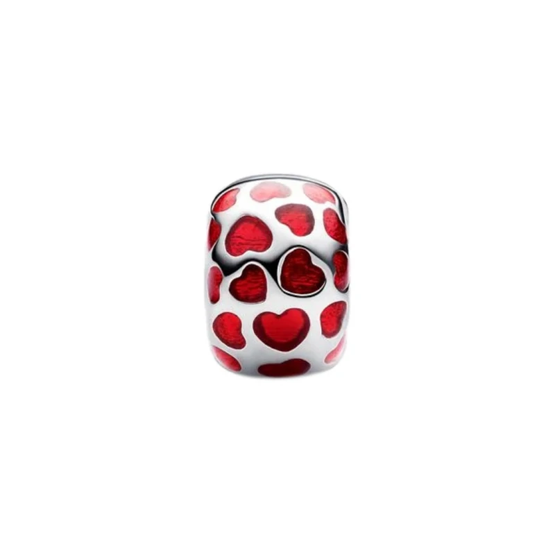 Conta Pandora Moments em prata de lei 925. Desenhada como um clip para as pulseiras, esta joia prateada destaca vários corações preenchidos por uma coloração esmaltada em vermelho, despertando um toque apaixonante ao visual feminino. Dedicada para celebrar o dias dos namorados como forma de expressão dos seus sentimentos com um toque delicado de cor vibrante.