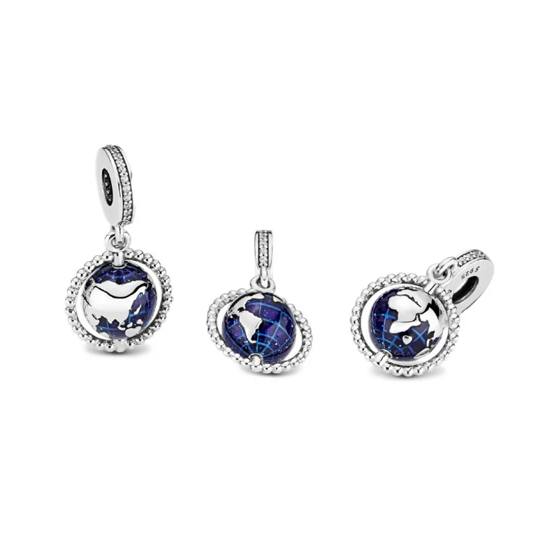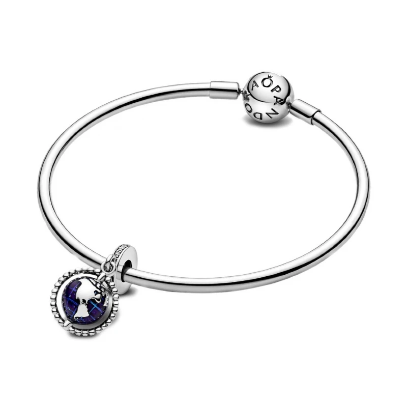 Crie um toque de aventura e brilho aliado ao seu look com esta conta Pandora feminina. De composição prateada sobre uma base de prata de lei 925, esta joia comporta um pendente do globo terrestre em esmalte azul com o desenho de cada continente, girando sobre o seu eixo para uma maior vivacidade e movimento.