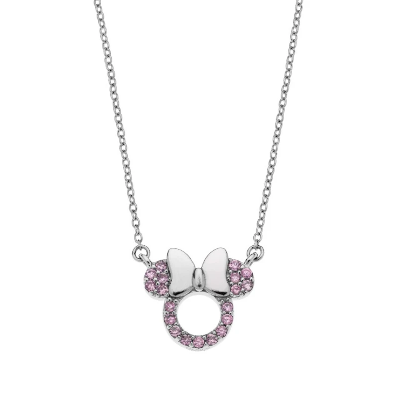Conheça este colar Minnie que é uma peça de prata inspirada na famosa personagem da Disney, Minnie Mouse. Geralmente, este tipo de colar apresenta elementos icónicos associados à personagem, como o laço que remete ao seu universo.