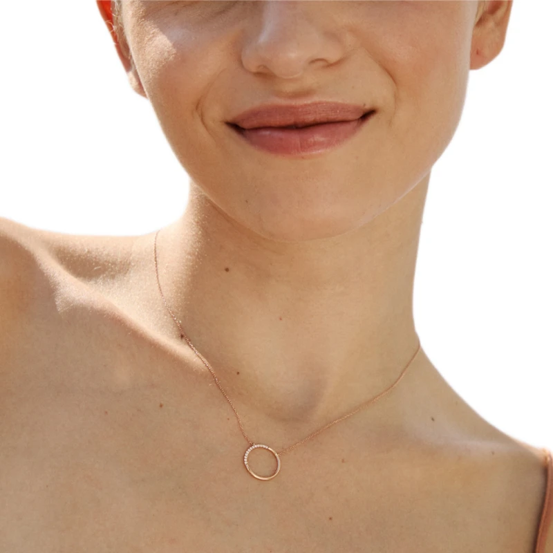 Colar feminino em ouro rosa de 18k da coleção Must: United, com destaque nos aro circular pendente sob o fio, com a cravação de diamantes de 0.070ct. Da linha Maxi Circle, esta é uma peça de joalharia elegante; de design moderno e minimalista, com brilhantes colocados com precisão e mestria joalheira: o complemento perfeito para abrilhantar o seu look. Todos os produtos da marca LeCarré Jewels são peças de joalharia certificadas, com as respetivas Marcas da Contrastaria, de acordo com a legislação em vigor, acompanhadas do certificado de autenticidade. Joia feita à medida. O prazo para entrega pode pontualmente ser alargado devido a rotura de stock no fabricante e o prazo será de 30 dias.