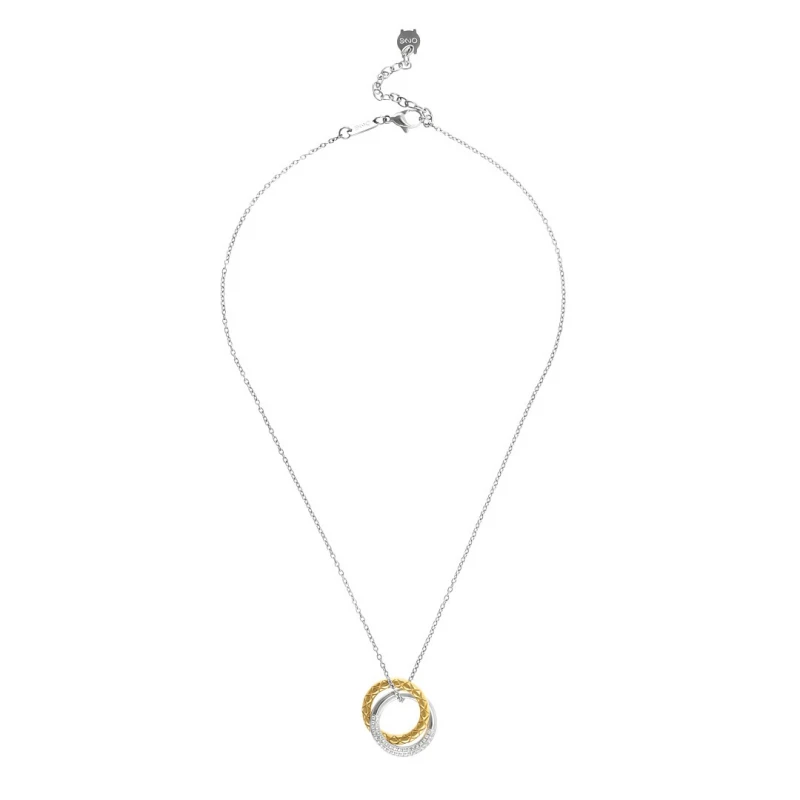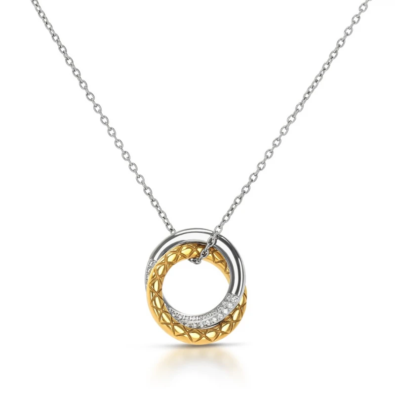 Colar prateado para mulher da coleção Delightful Circle da One Jewellery. Elaborado em aço, esta joia destaca o design e brilho presente no seu pendente de dois aros circulares bicoloridos entrelaçados. A argola dourada apresente um visual com um padrão geométrico que comporta alguma textura, enquanto que a argola prateada polida é preenchida em metade com a cravação de zircónias brancas. Um modelo elegante que espalha confiança e uma atenção aos detalhes sobre o visual feminino.