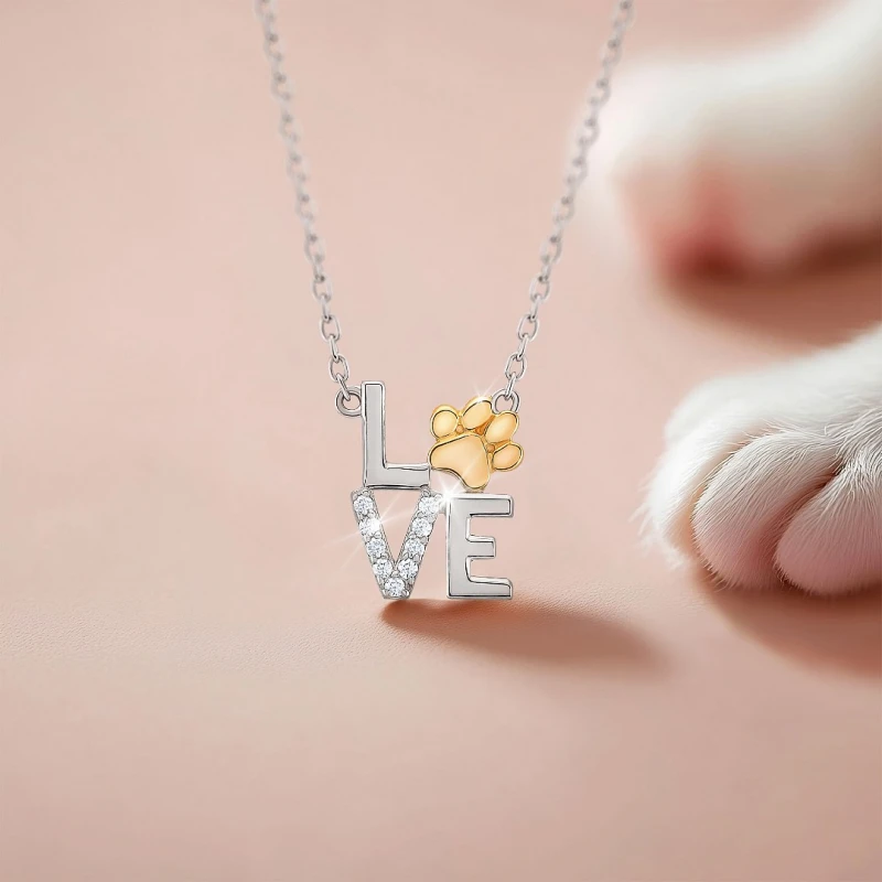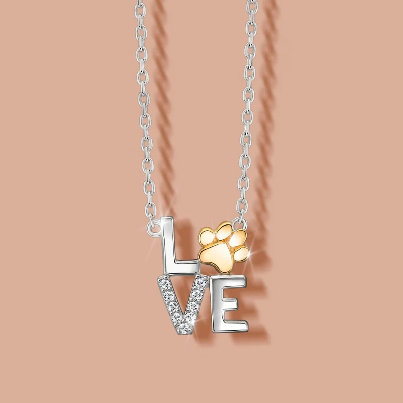 Elegante colar feminino Unike em prata de lei 925, uma joia de coloração prateada de acabamento luminoso que se destaca através do seu pendente onde a palavra "LOVE" evoca um significado especial. Conferindo um toque brilhante e sofisticado com a cravação de zircónias sobre a letra "V", a joia cria um contraste cromático com a letra "O" ser substituída por uma encantadora pegada em prata banhada em ouro dourado de 14kl. Ideal para qualquer amante destes companheiros fiéis de quatro patas que procuram contar uma história, demonstrando um amor incondicional onde o simbolismo se mantém sempre perto do coração.