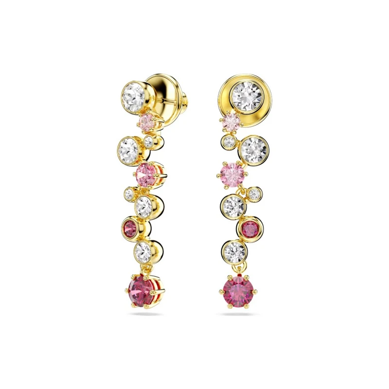 Este conjunto Constella em tom dourado foi criado tendo em mente cores joviais. Combinando um colar e um par de brincos, cada peça é adornada com cristais e Swarovski rosa e vermelhos em vários tamanhos e tonalidades. É um conjunto acolhedor e vívido para amplificar qualquer visual.