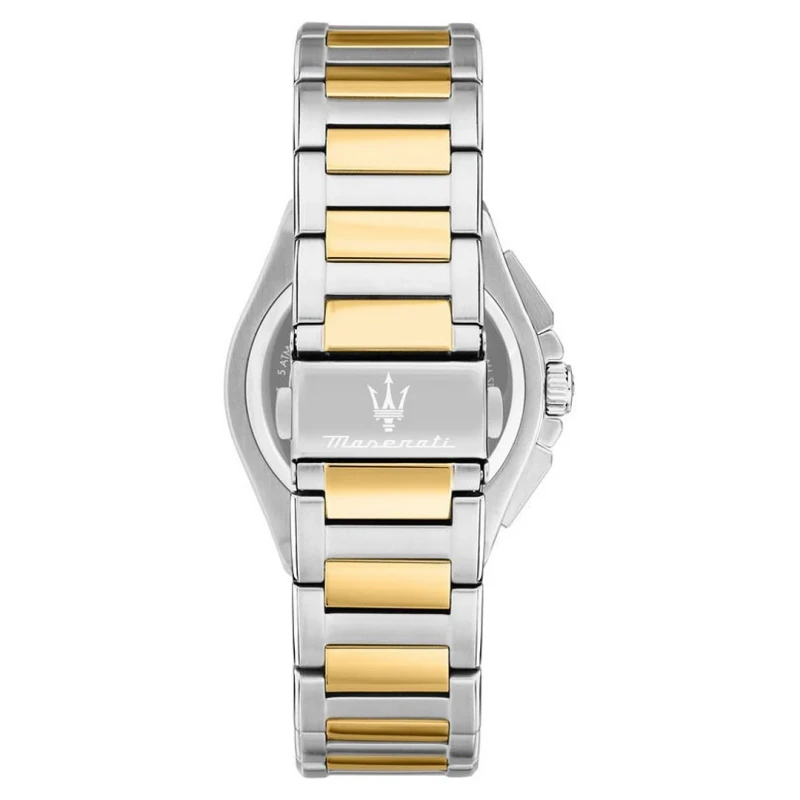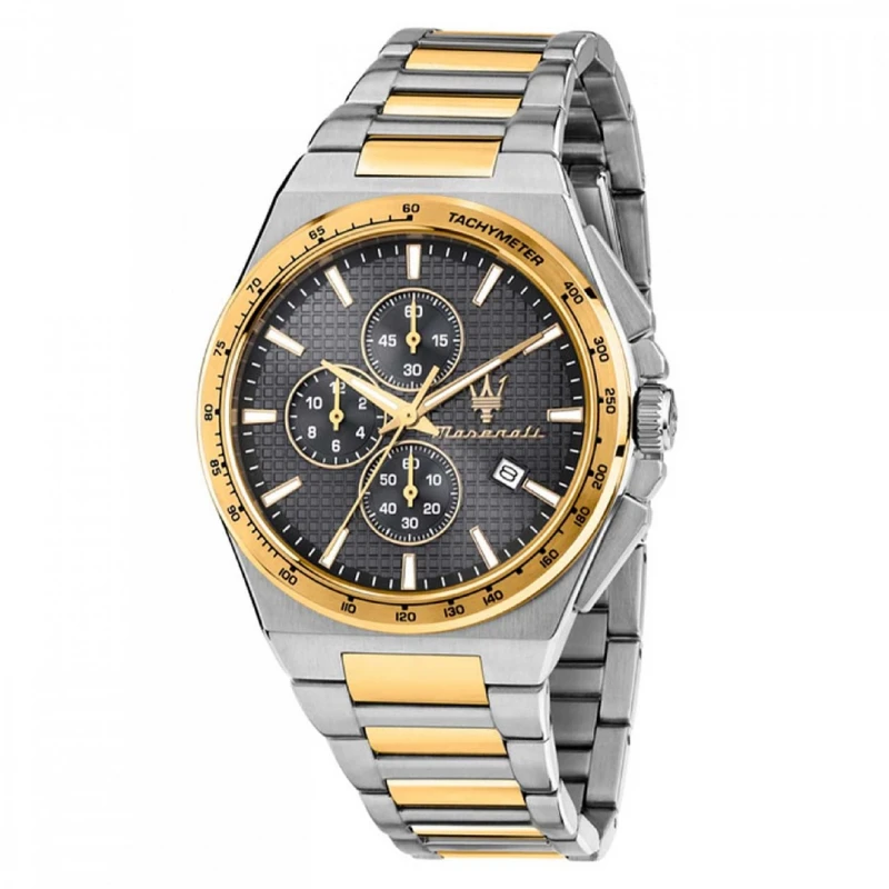 Relógio Maserati da linha Velocitá, um acessório trabalhado em aço inoxidável prateado e dourado dedicado para um look masculino. Habilmente detalhado com um mostrador preto texturizado em estilo cronógrafo e envolvido por um bisel dourado, o design deste modelo eleva toda a experiência técnica e estética magistral da marca. Uma gama masculina que incorpora um toque luxuoso ao visual.