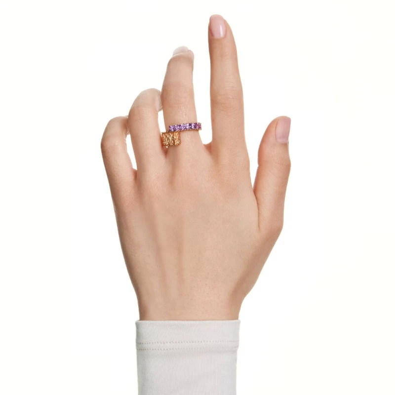 Este incrível anel Matrix oferece uma colisão de cores e formas. A banda sobreposta apresenta revestimento em tom dourado e cristais Swarovski de cor roxa e caramelo em lapidações quadradas e baguete. Uma escolha vívida que combina lindamente com a pulseira a condizer.
