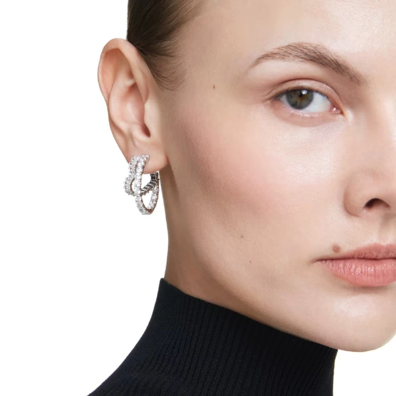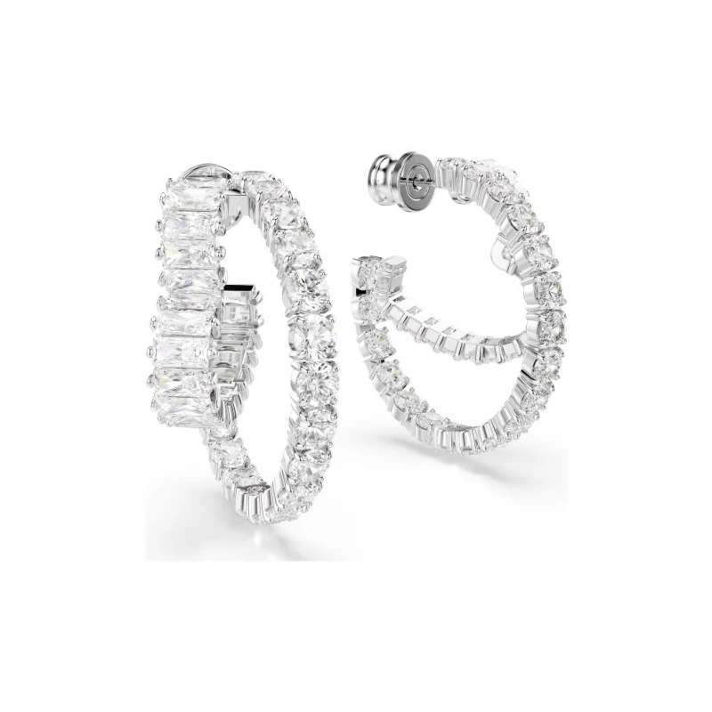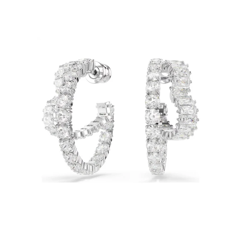 Estes magníficos brincos Matrix são irradiantes e românticos. Cada argola revestida a ródio apresenta uma forma de coração aberto no centro, totalmente adornado com Swarovski Zirconia de lapidação baguete num tom incolor. Uma escolha sublime para expressão pessoal que inundará o seu estilo de luz.