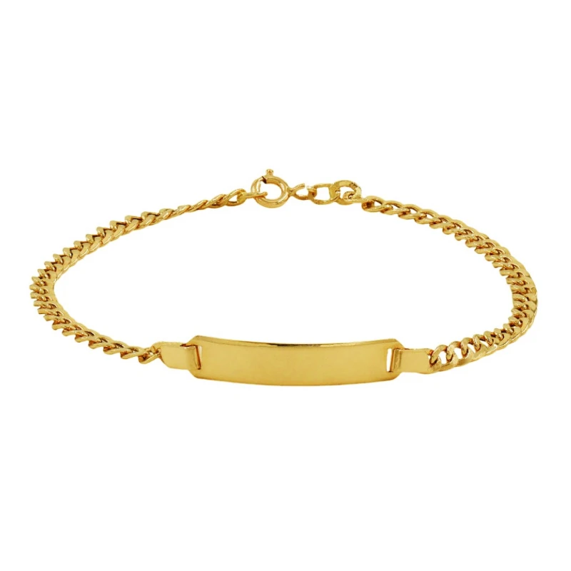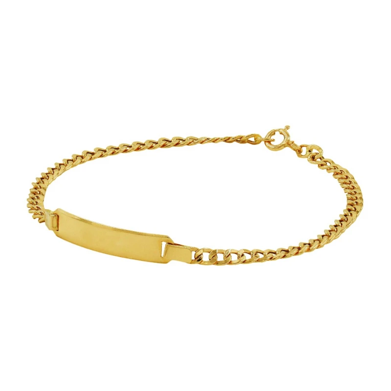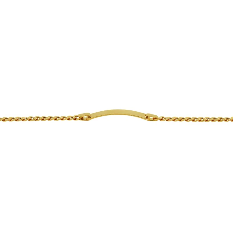 Envolvente pulseira em ouro de 19.2 quilates. Brilhante com uma graciosa coloração dourada, a malha de barbela da joia une-se a uma chapa central que desperta um brilho contagiante combinada de um design intemporal. De fabrico manual 100% português, este modelo versátil adiciona um visual único no design simples, possibilitando o seu uso para diferentes momentos ou eventos diários.