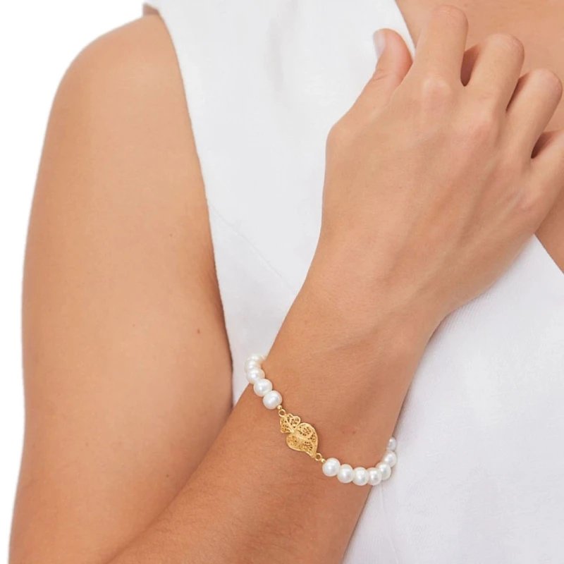 Pulseira de mulher da Portugal Jewels, elaborada numa malha elástica preenchida de pérolas de água doce que se unem a uma medalha em prata de lei 925 de coloração dourada. Desenhada na forma de coração de viana sob a tradicional arte da filigrana, esta joia transmite um contexto simbólico caraterístico ao hábil trabalho da joalharia tradicional portuguesa.
