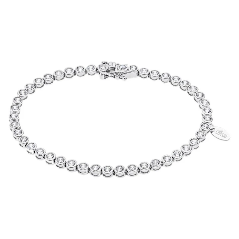 Elegante pulseira feminina em prata de lei 925 da Lotus Silver. Habilmente trabalhado para criar um brilho intenso, esta joia é adornada por um conjunto de zircónias transparentes envolvidas em bases prateadas da malha. Um modelo dedicado para mulheres cosmopolitas, de alma romântica e com identidade própria para utilizar diariamente ou momentos especiais para a noite.