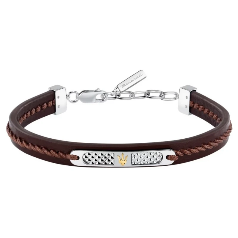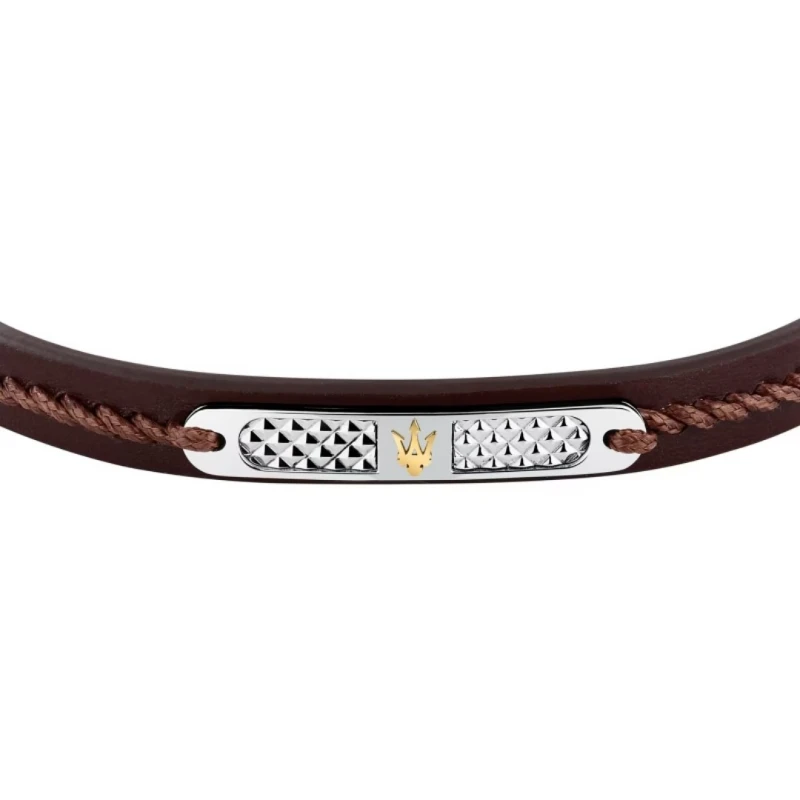 Pulseira para homem da Maserati, um modelo trabalhado em couro genuíno de coloração castanha com um fecho em aço inoxidável prateado e com uma chapa com texturas e detalhada com o logo da marca em dourado. Um modelo de uma marca emblemática que retrata criações originais, carregada de classe e requinte. A combinação perfeita de elegância com um toque desportivo.