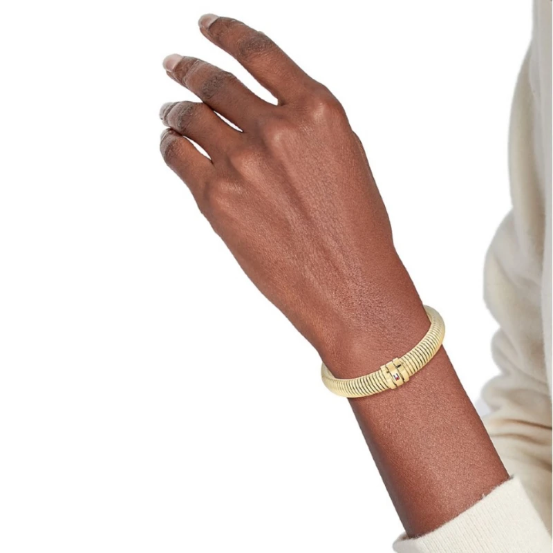 Desperte um visual singular com esta pulseira feminina da linha Tommy Hilfiger Stretch. Desenhada num estilo intemporal, a malha dourada desta peça apresenta um design de elos em faixa elástica que garante um toque descontraído, destacando três argolas, na qual uma envolve a peça com o logótipo colorido da marca. Eleve o look conferido ao visual de uma mulher um aspeto sóbrio e moderno.