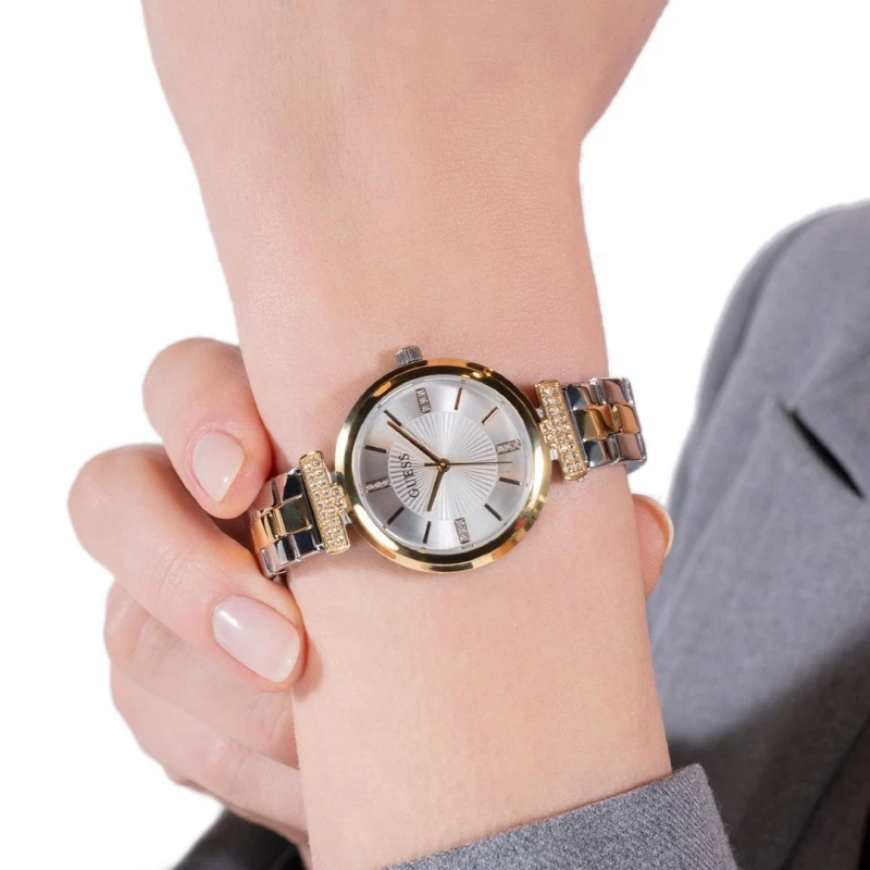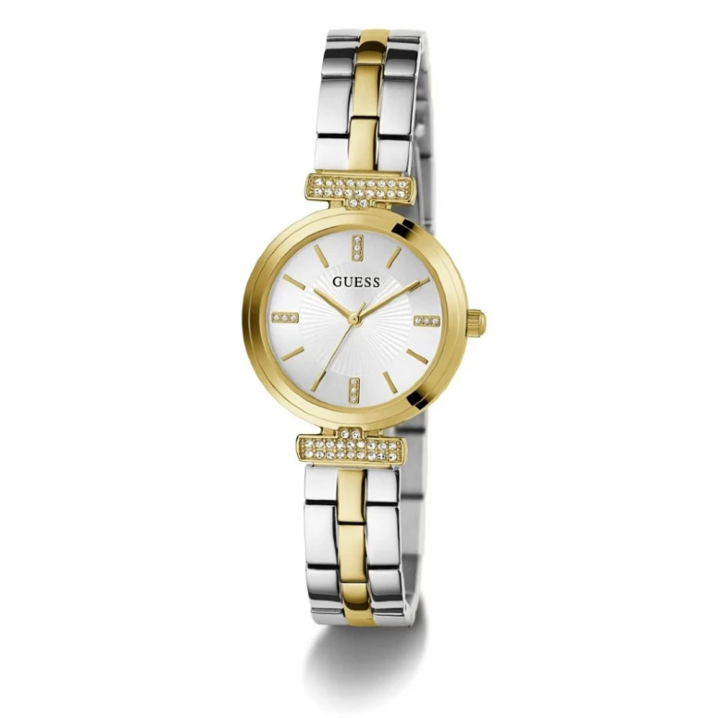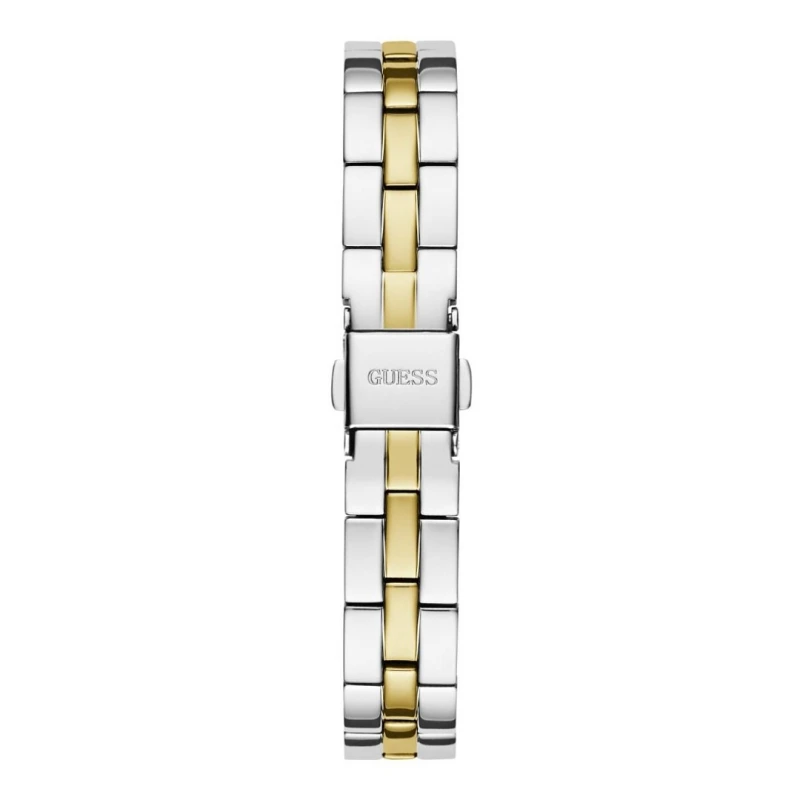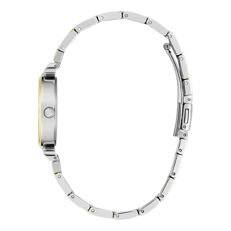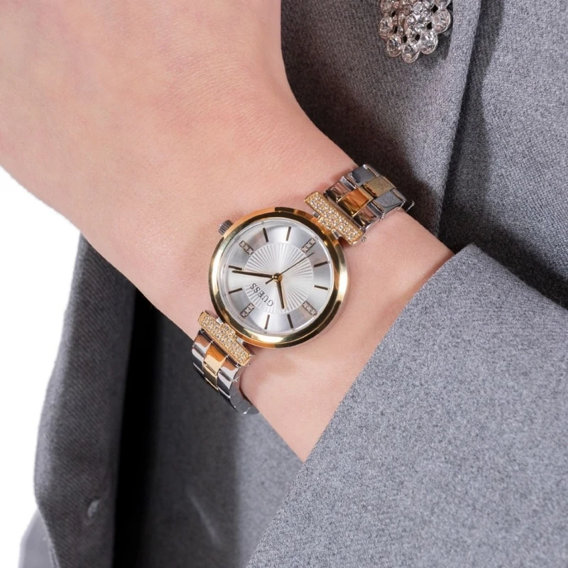 Elegância com subtileza são transmitidos no design minimalista deste relógio Guess feminino da linha Array. Com uma paleta bicolorida em prateado e dourado, este modelo alia a sua bracelete com a caixa através de uma pequena base cravada de zircónias transparentes, evocando um efeito luminoso sereno que se envolve delicadamente no look de uma mulher que procura demonstrar um toque de charme refinado.