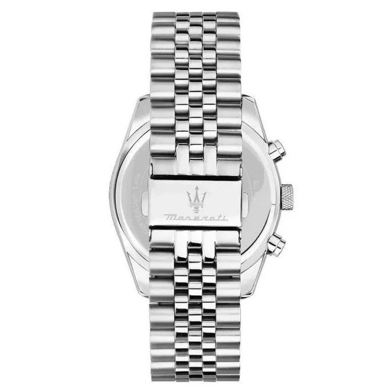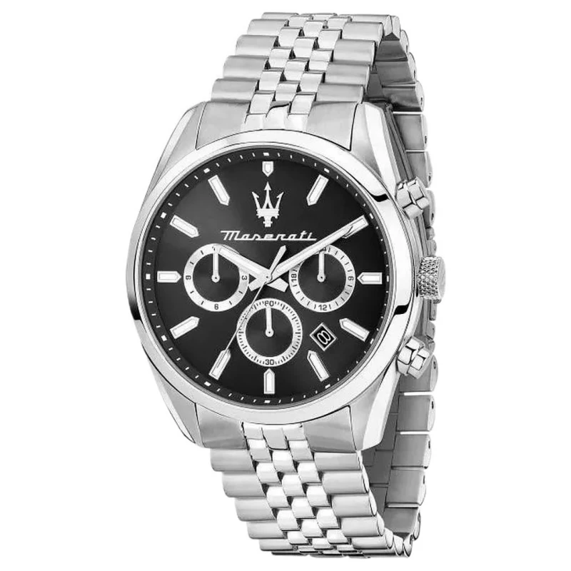 Sofisticado relógio Maserati masculino da linha Attrazione. Elaborado em aço inoxidável prateado na bracelete e caixa, este modelo apresenta um mostrador preto estilo cronógrafo e detalhado com um calendário no sentido entre os ponteiros das 4 e 5 horas. A perfeição da técnica e a atenção aos pormenores de luxo que a Maserati dedica a todos os carros que produz, refletem-se também nos seus relógios. Uma das marcas mais emblemáticas da história é retratada nestas criações originais, carregadas de classe e requinte.