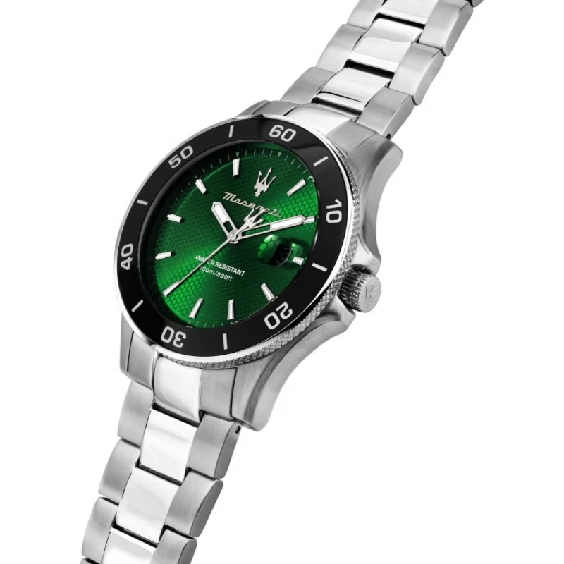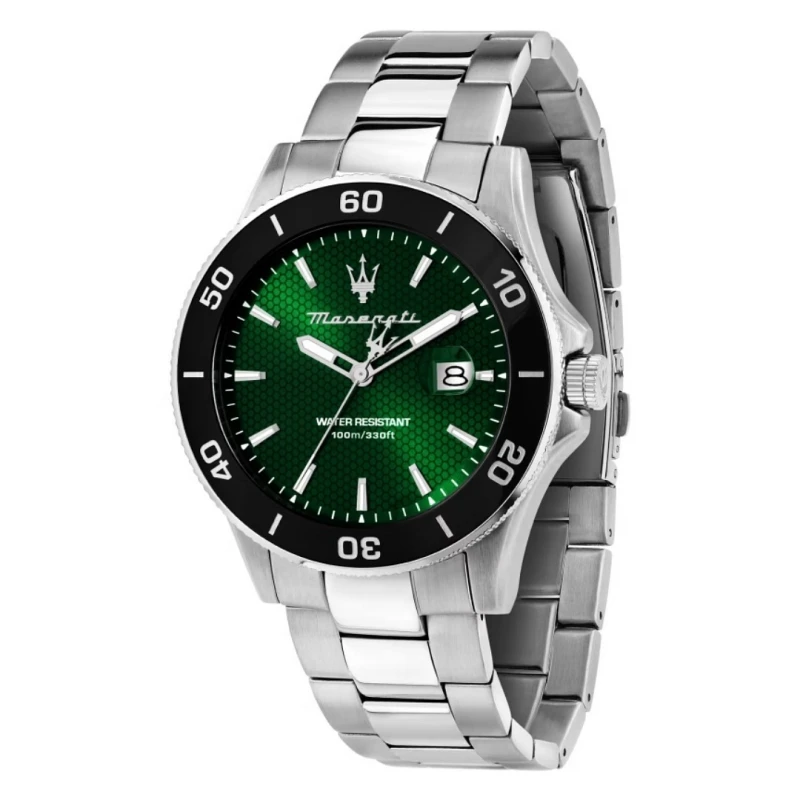 Destaque um visual de luxo com este relógio masculino em aço inoxidável, de coloração prateada, da Maserati Competizione. Elaborado para demonstrar um design requintado com um toque desportivo, este modelo contrasta de forma vibrante com o seu mostrador verde envolto de um bisel preto. Cada elemento presente detalha toda a experiência técnica e estética magistral da marca sob modelo de acessórios.