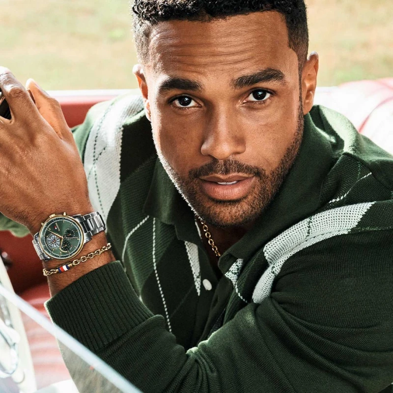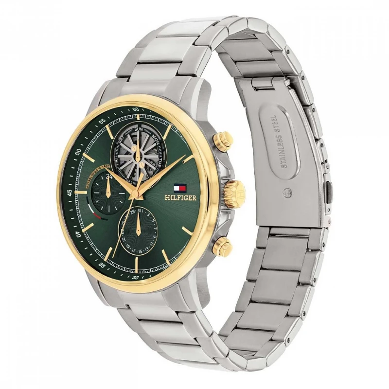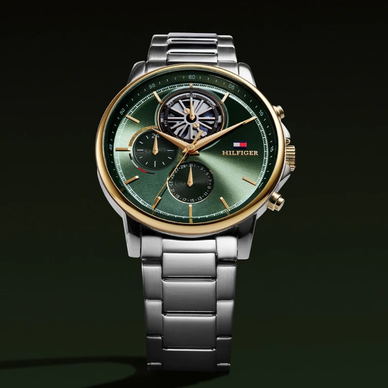 Dê vida e personalidade ao seu visual com este relógio masculino em aço inoxidável da Tommy Hilfiger. Com uma bracelete em elos que se liga a uma caixa circular com um bisel em dourado, o mostrador deste modelo torna-se o destaque com a sua coloração verde, detalhado com apontamentos em verde e com o seu estilo cronógrafo. Um despertar à tradição da marca unindo-se a um formato moderno e funcional transmitindo um design que evoca confiança e bom gosto.